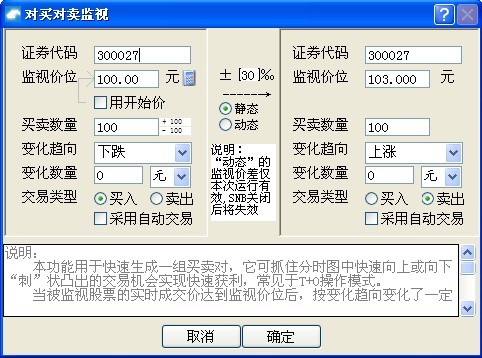 说明:本功能用于快速生成一组买卖对,它可抓住分时图中快速向上或向下“刺”状凸出的交易机会实现快速获利,常见于T+0操作模式。当被监视股票的实时成交价达到监视价位后,按变化趋向变化了一定数量时交易条件成熟。