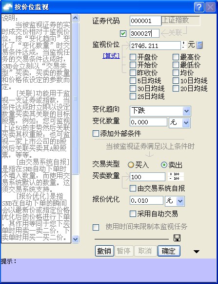 说明: 当被监视证券的实时成交价相对于监视价位,按“变化趋向”变化了“变化数量”时交易条件达成,当监视任务的交易条件达成时,SNB会立刻以“交易类型”买卖,买卖的数量和价格依设定的参数而定。