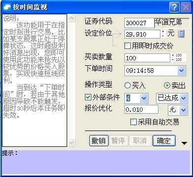 说明:该功能用于在指定时刻进行交易。比如某支股票正处于停牌状态,这时超级利好消息出现,您即可使用此功能来抢先以较优势的价格买入股票,实现快速短线获利。